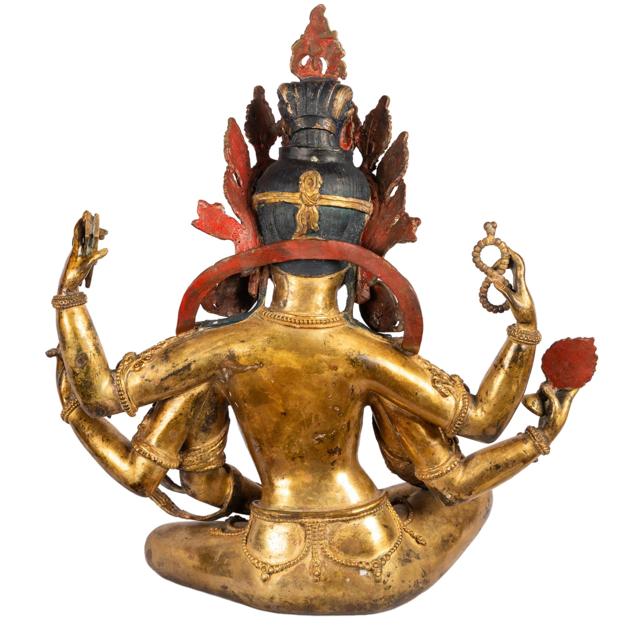 This finely cast gilt copper alloy sculpture, gilded with 24 karat gold, represents Vasudhara (Basundhara), the Buddhist goddess of wealth, prosperity, and abundance, here depicted in her six-armed form.