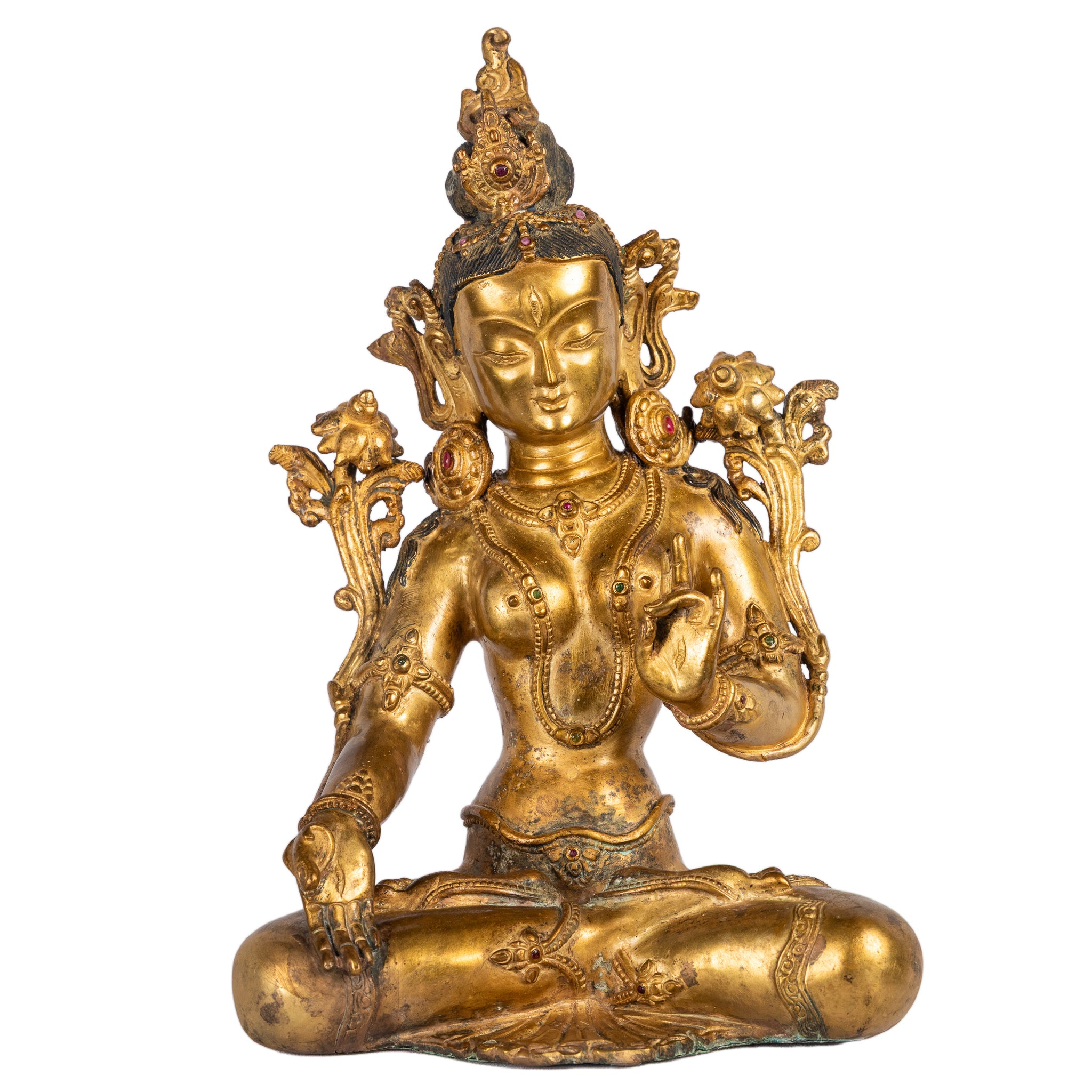 Adorned with an elaborate crown and finely detailed ornaments, she appears here in her bodhisattva form, framed by lotus stems rising on either side, symbols of purity and spiritual awakening. The refined detailing reflects the exceptional craftsmanship of Newar artisans from the Kathmandu Valley, whose traditions have shaped Himalayan sacred art for centuries.