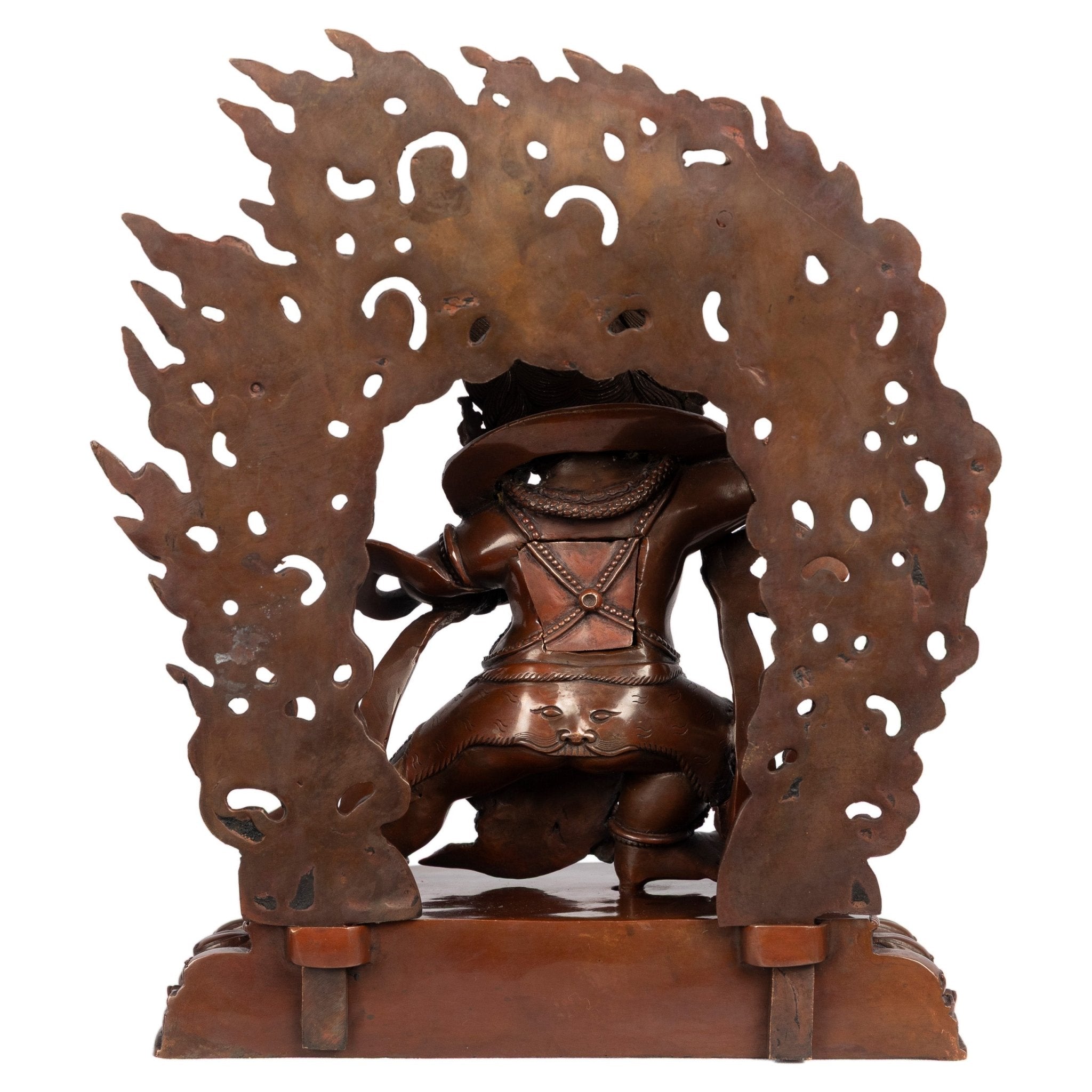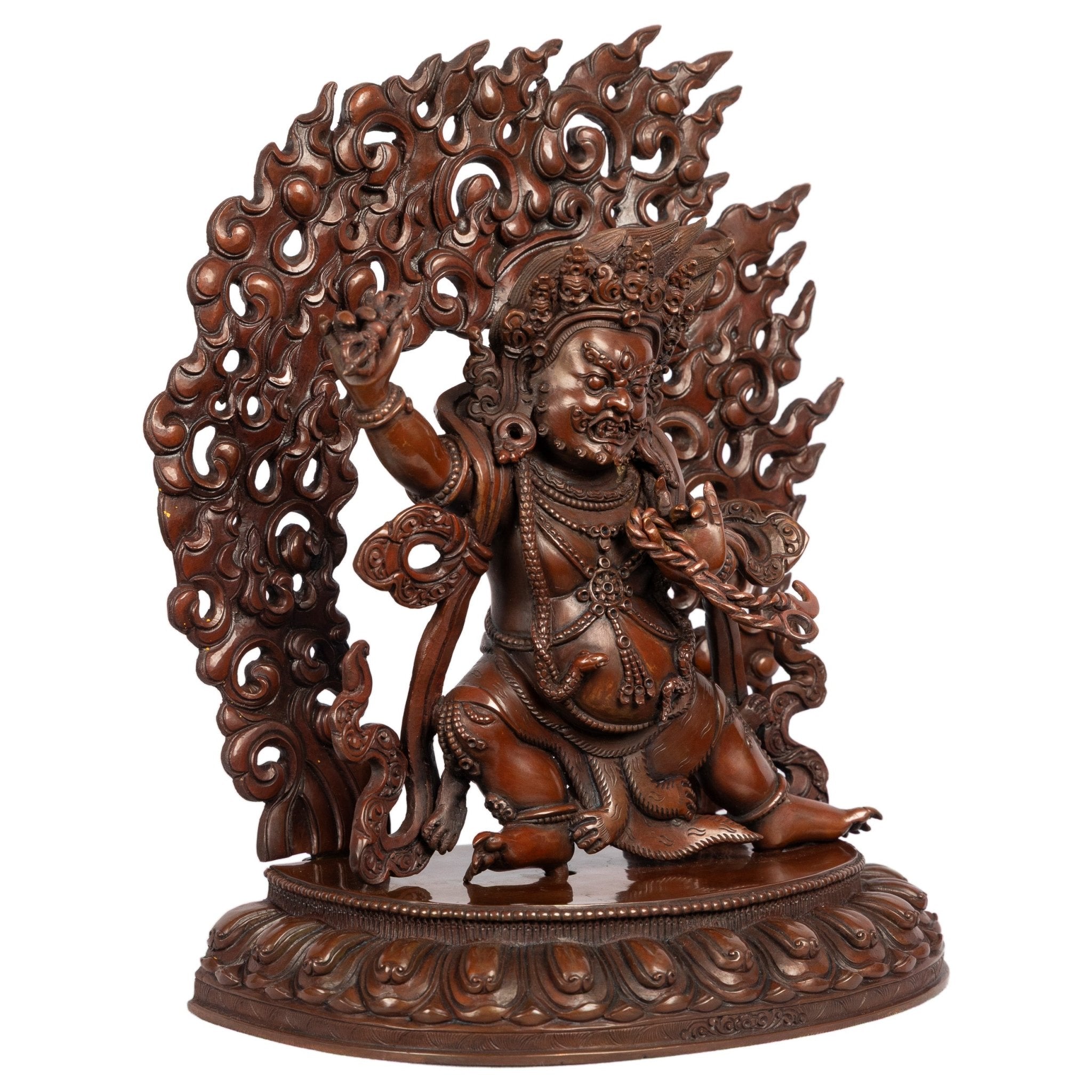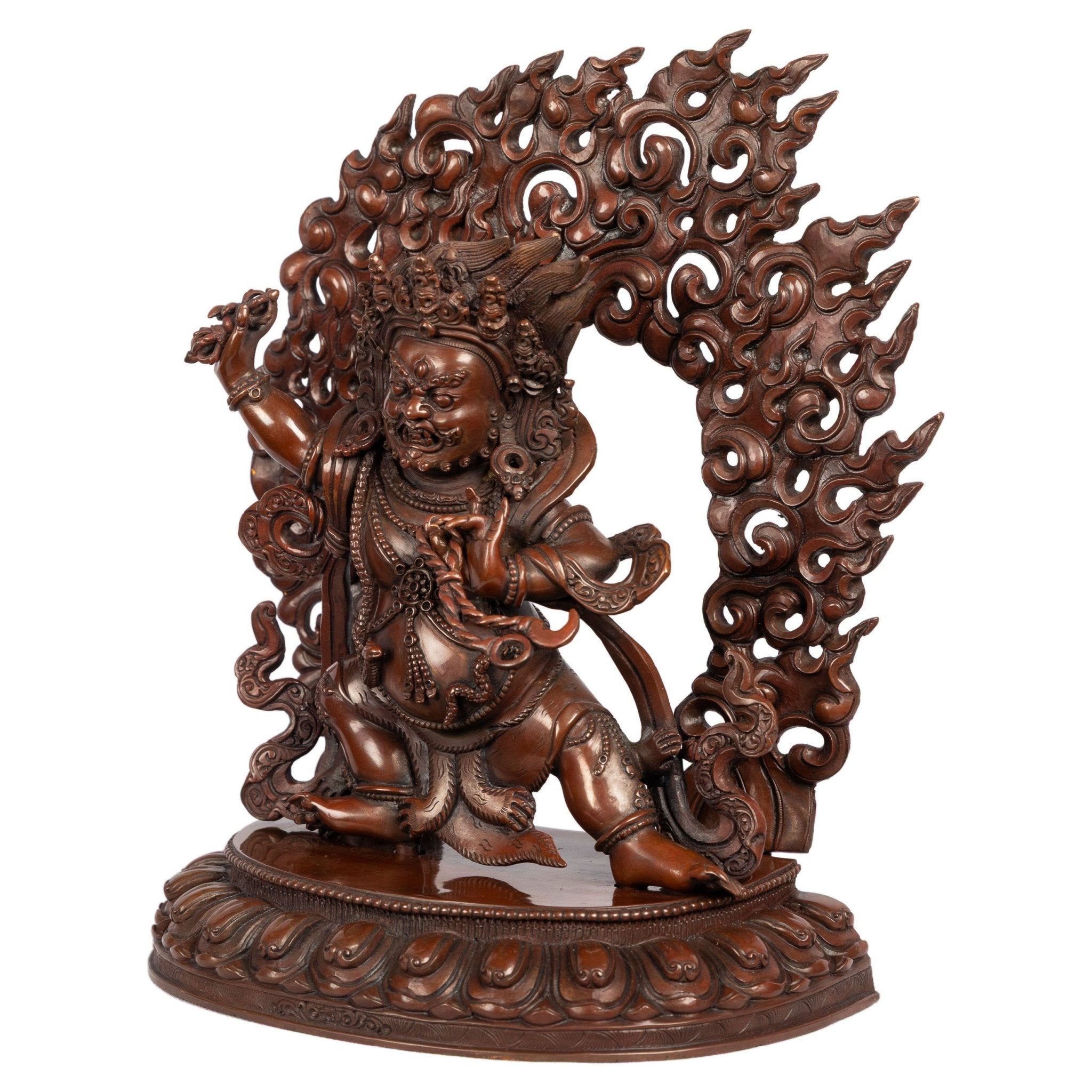 The swirling flames and intricate detailing enhance the sense of movement and intensity, characteristic of Himalayan tantric iconography.