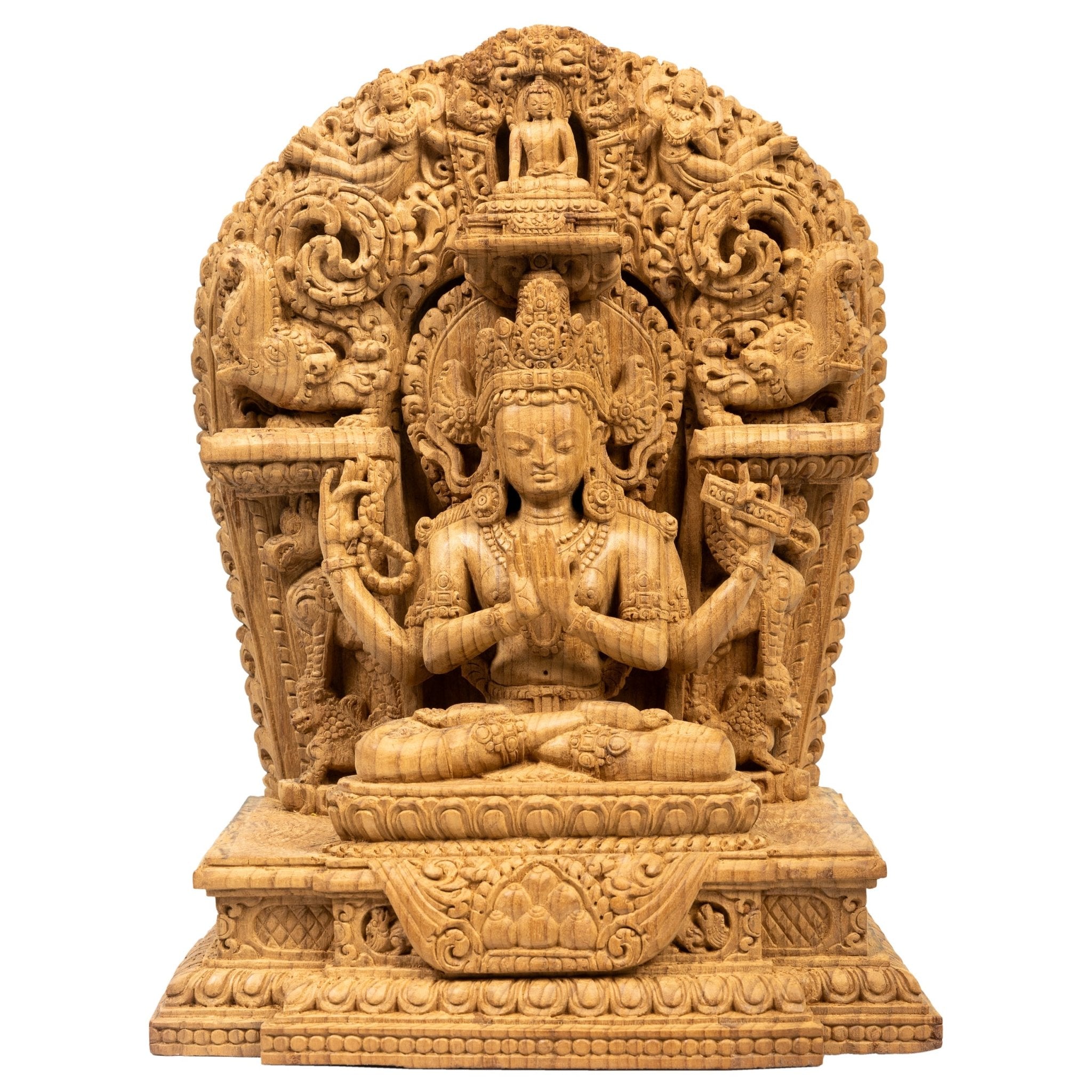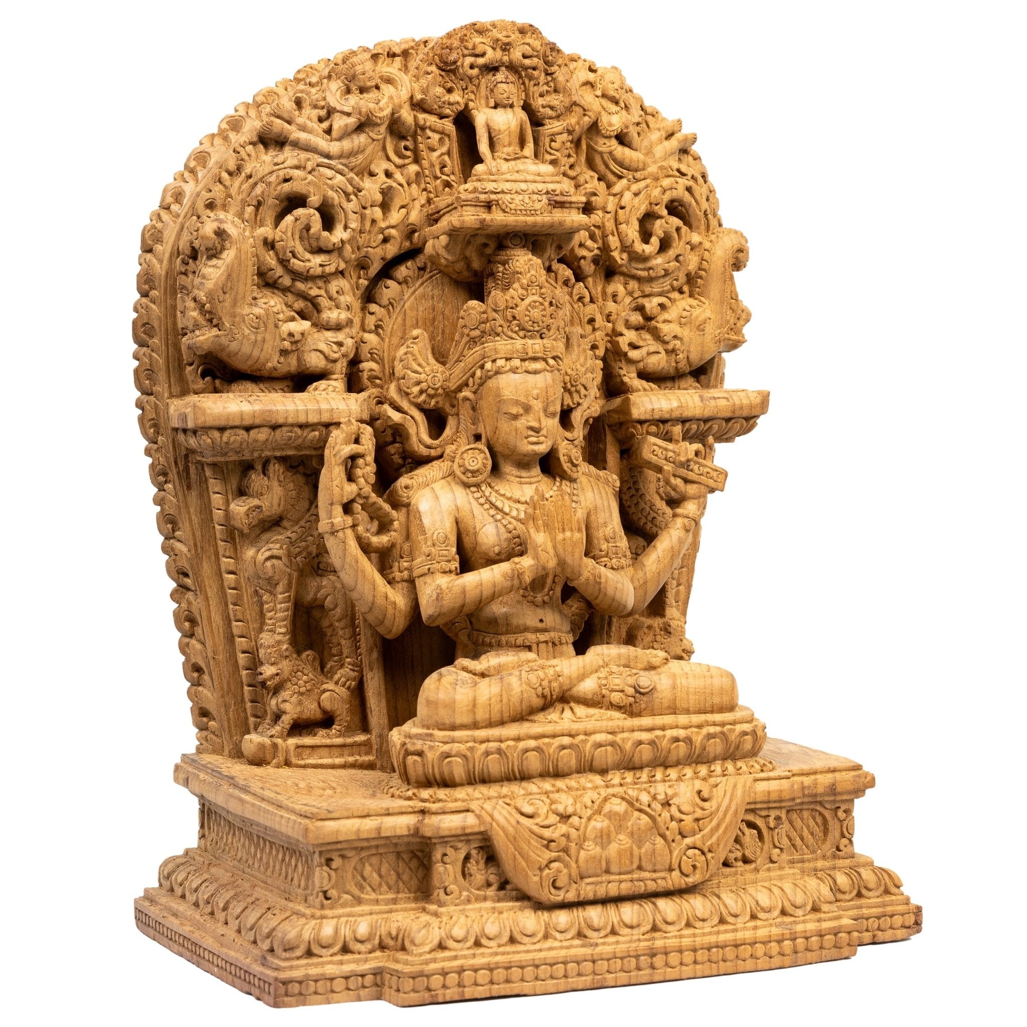 Cette exceptionnelle sculpture en bois représente Prajñāpāramitā, la déesse de la Sagesse transcendante, vénérée comme la mère de tous les Bouddhas.
